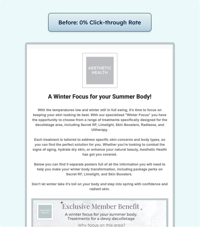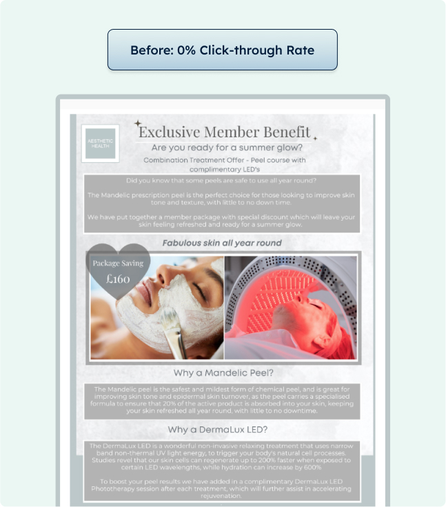 Aesthetic Health is one of the UK’s most respected aesthetic clinics, known for their premium treatments and loyal patient base. Despite their strong reputation and dedicated community, their email marketing wasn’t living up to its potential. Newsletters were sent sporadically, mostly as announcements, with no consistent strategy. While open rates remained high thanks to the trust patients had in the brand, engagement beyond that was minimal. Click-through rates were often at, or worryingly close to 0%.
